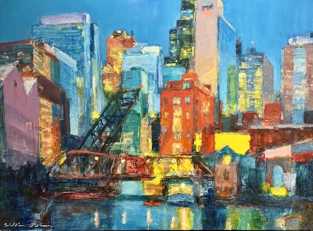 An artist for over 40 years, William is best known for his impressionistic paintings of the City of Chicago, including striking and colorful images of The Board of Trade, the Chicago Theater and urban scenes along the Chicago River. He is also an Emeritus Professor of Painting and Drawing at Oakton College.