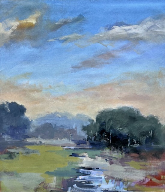 As a child, crayons were her love. Now as an adult, each color evokes an emotion that she portrays in her work. The evolution of her work comes from a fascination with the outdoors, whether it’s walking down a wooded path, a city street or sitting along a river. These visual images are quickly captured in palette knife studies. Once in her studio, larger, generally more abstract paintings are born, more loose and freeing.